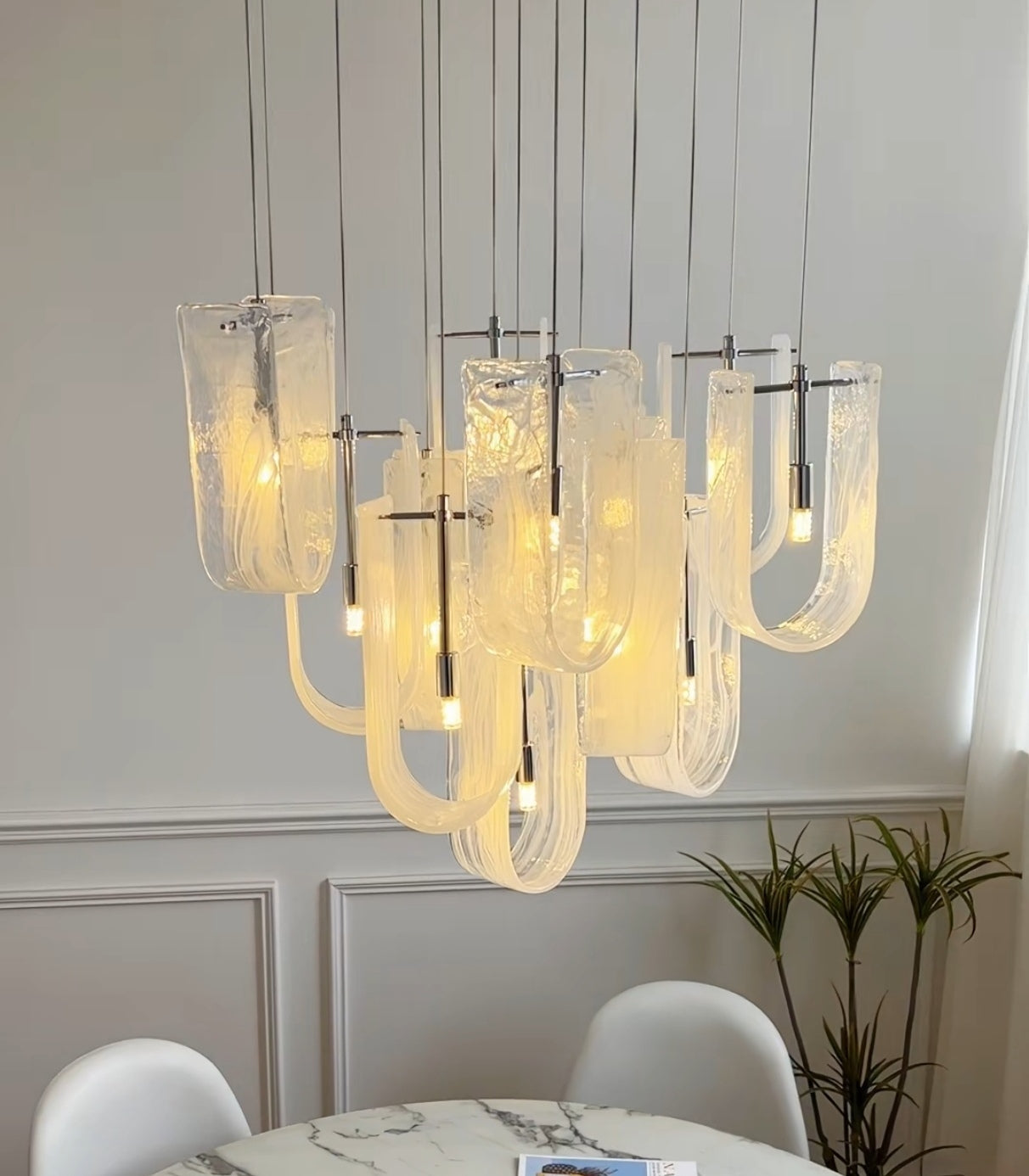 The diffused light offers a warm, inviting glow, making it ideal for dining rooms, entryways, or living spaces, blending luxury with modern aesthetics.